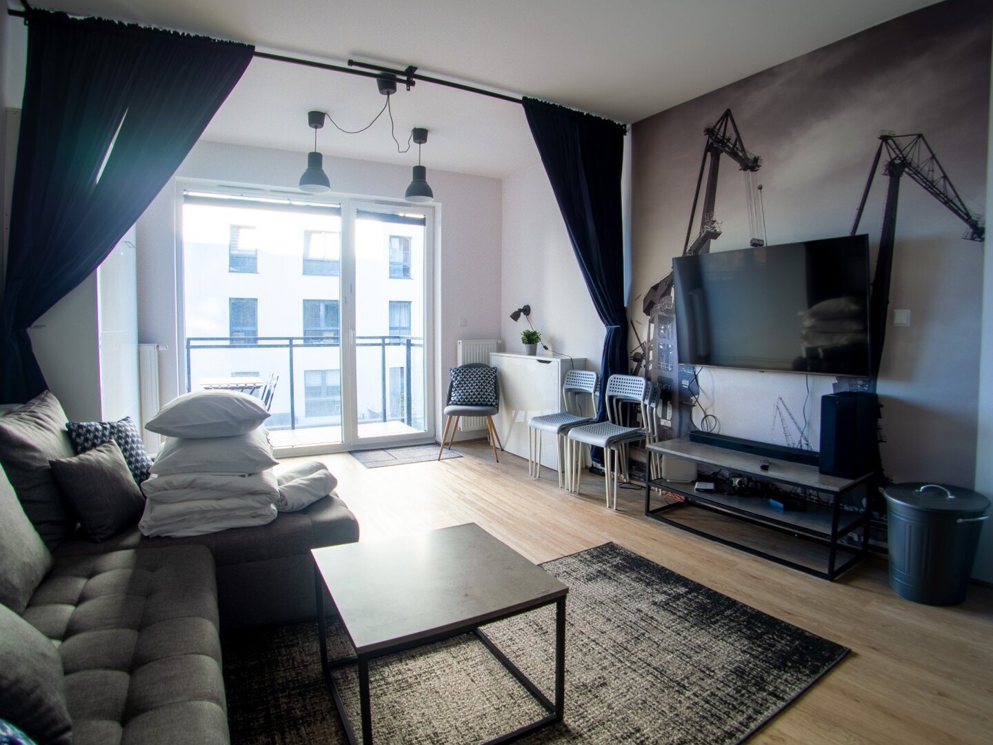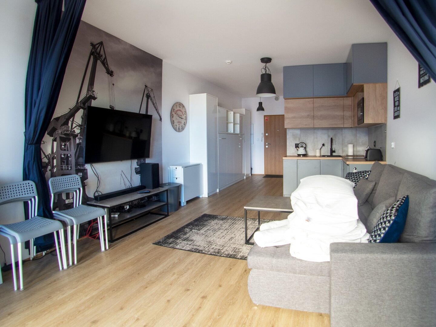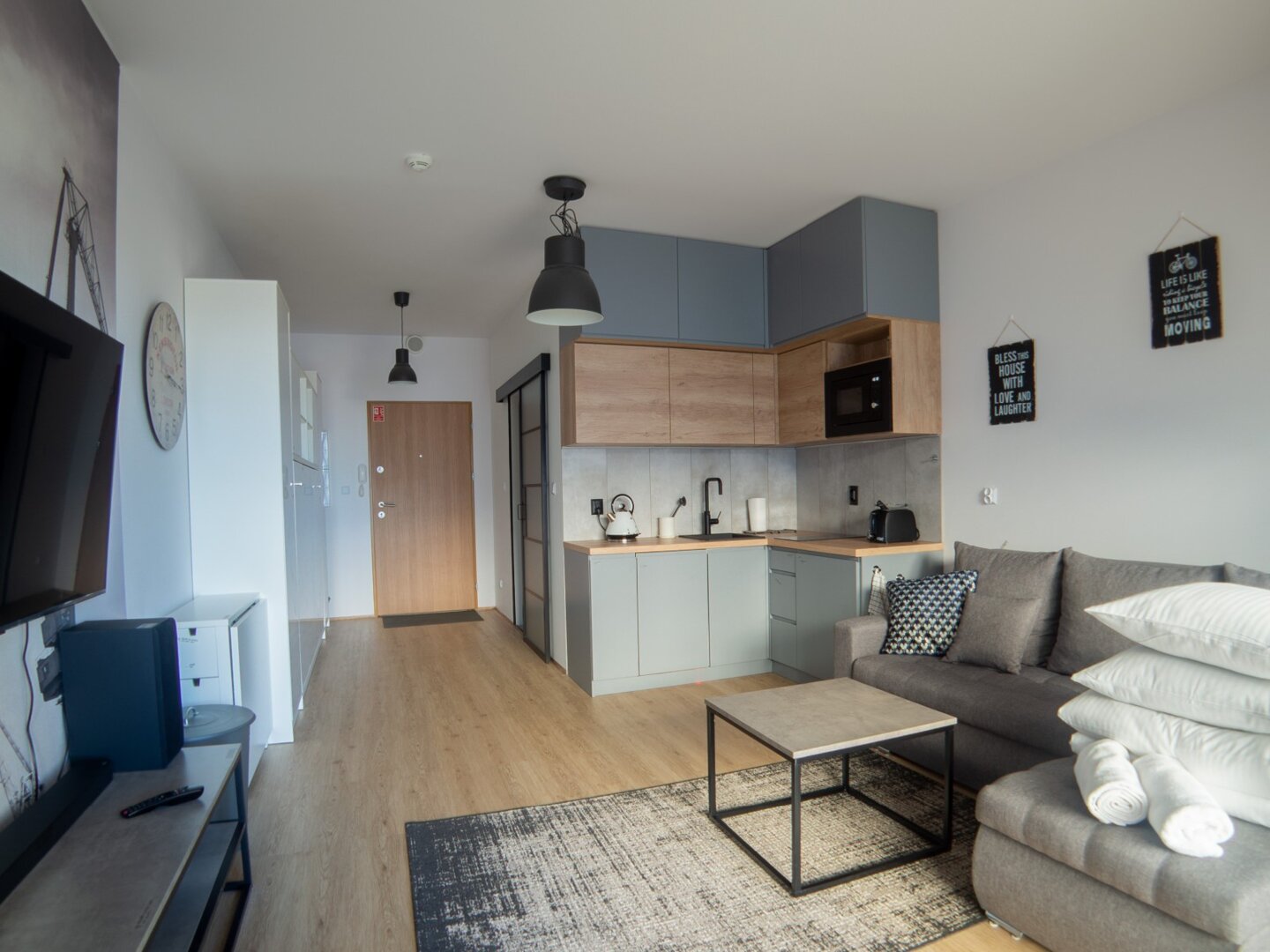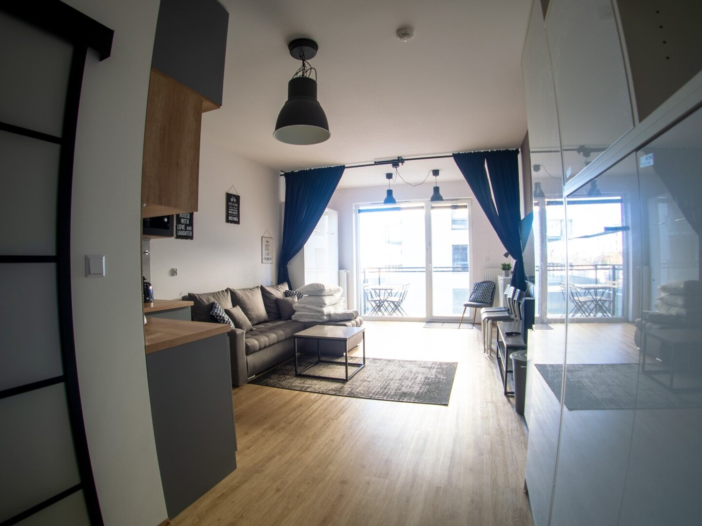 Apartament typu studio 30 metrów kwadratowych położony na 2 piętrze w nowoczesnej kamienicy. Mieszkanie doskonałe dla dwóch osób ceniących komfort i wygodę, możliwość zakwaterowania nawet 5 osób. Mieszkanie całkowicie wyposażone. Otwarta przestrzeń z aneksem kuchennym, pełna zabudowa z AGD: lodówka, płyta indukcyjna, mikrofalówka, toster, czajnik elektryczny. W części sypialnianej podwójne łóżko z opcją złożenia na dzień. "Sypialnia" z opcja oddzielenia zasłonami. W części wypoczynkowej rozkładana sofa, stolik, telewizor, bezpłatne WiFi. Prywatna łazienka z wanną z opcją prysznica, pralką. Ponadto w mieszkaniu znajduje się łóżko pojedyncze, które można na dzień złożyć. Do mieszkania przynależy balkon.