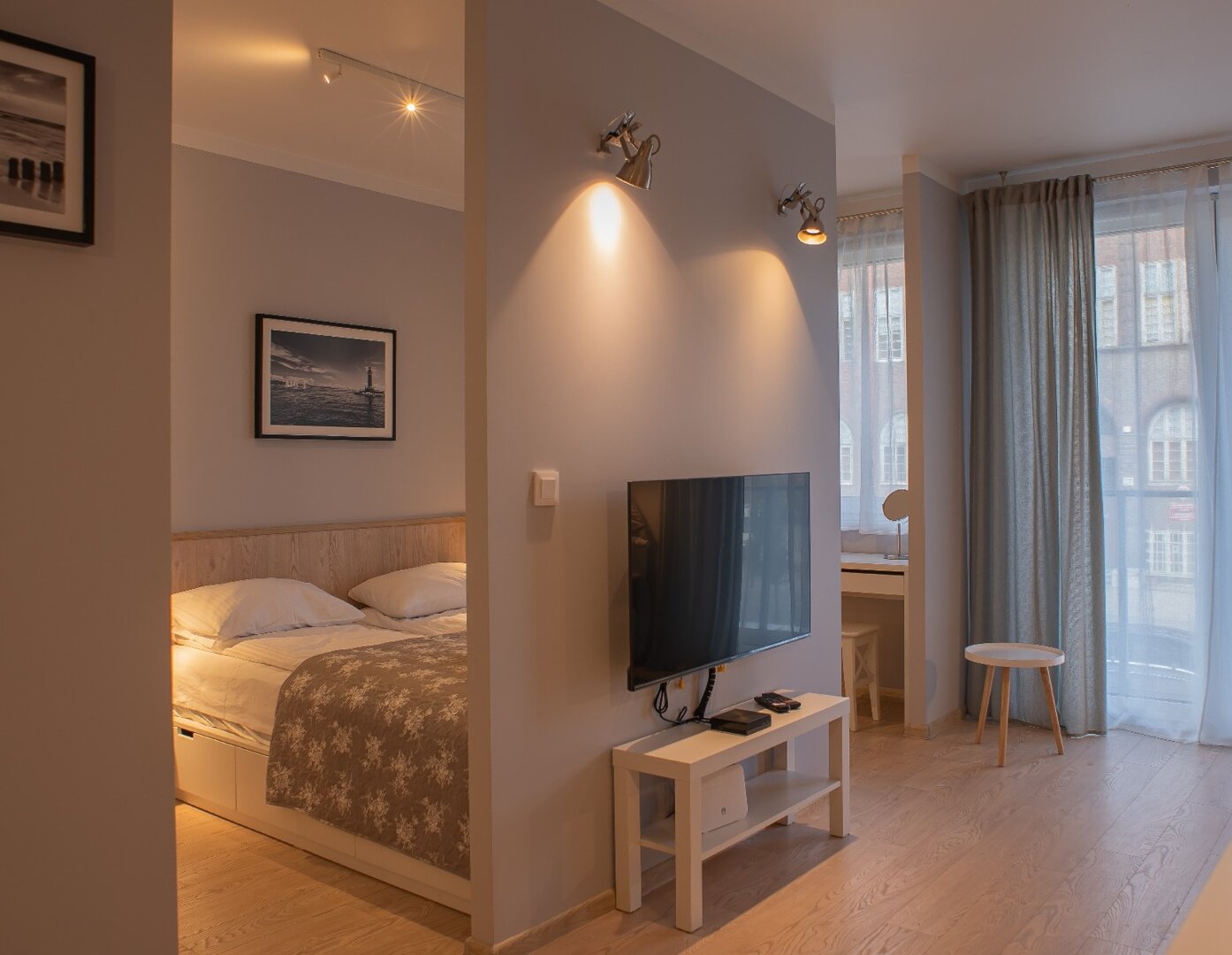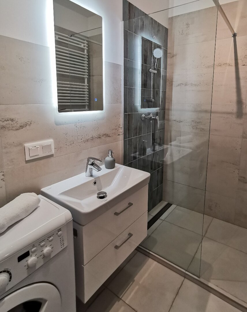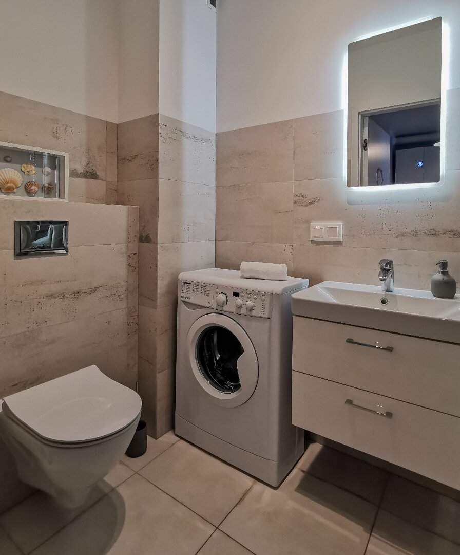 - Apartament typu studio 32 metry kwadratowe położony na 1 piętrze w nowoczesnej kamienicy. Mieszkanie doskonałe dla dwóch osób ceniących komfort i wygodę, możliwość zakwaterowania czterech osób. Mieszkanie całkowicie wyposażone. Otwarta przestrzeń z aneksem kuchennym, pełna zabudowa z AGD: lodówka, płyta indukcyjna, piekarnik. czajnik elektryczny. W części sypialnianej podwójne łóżko, sofa rozkładana, stolik, telewizor, balkon, bezpłatne WiFi. Prywatna łazienka z prysznicem, pralką