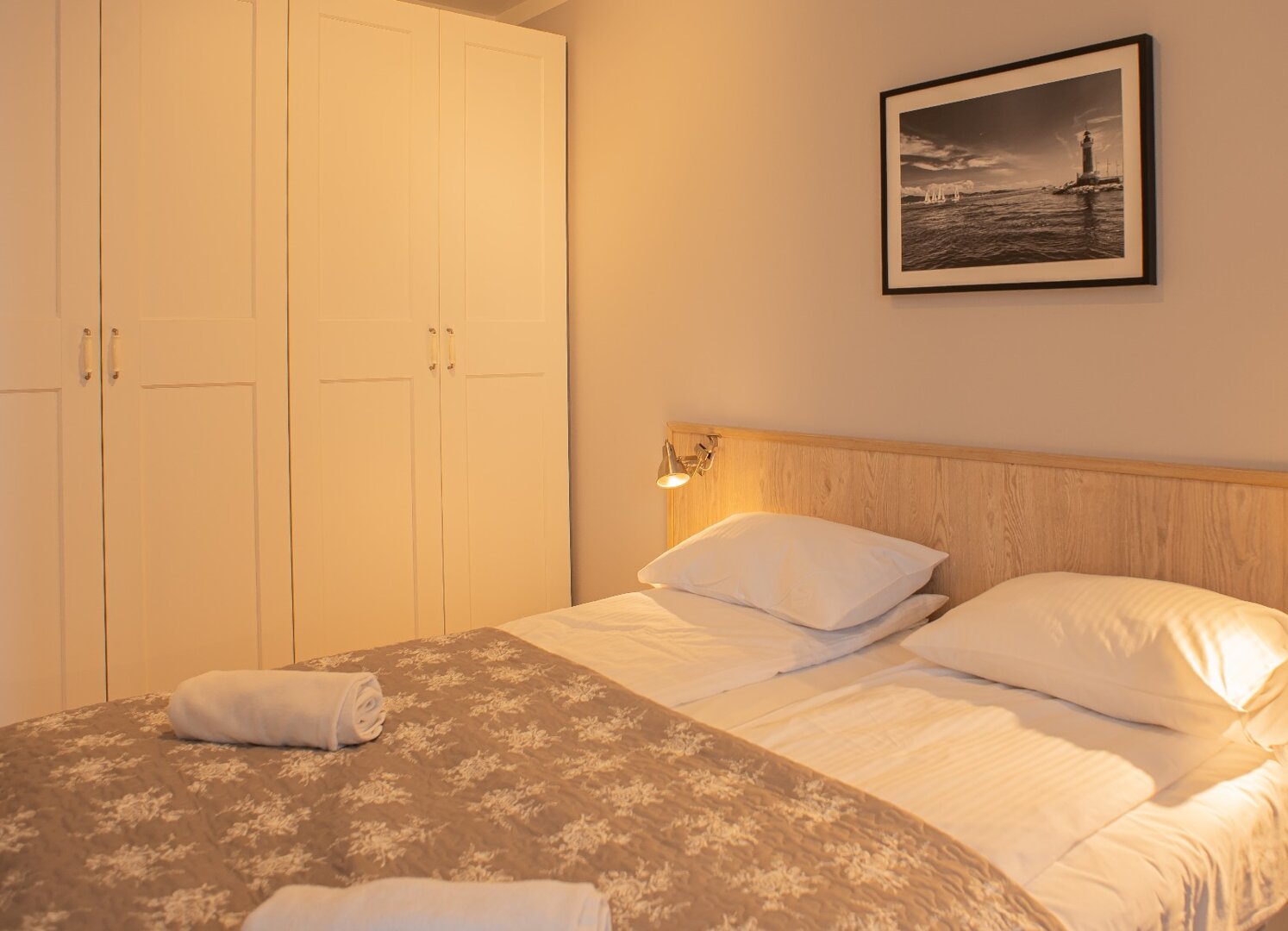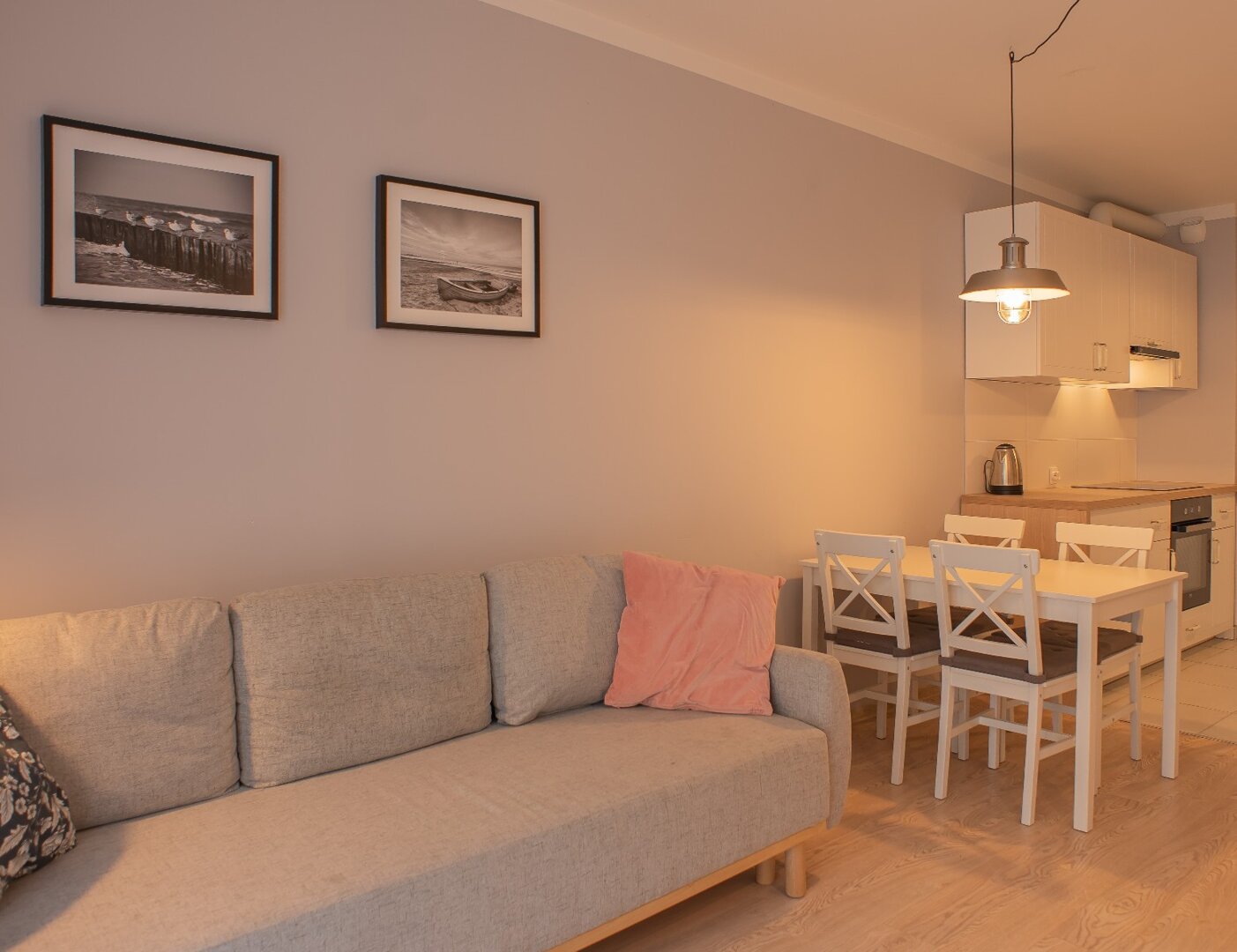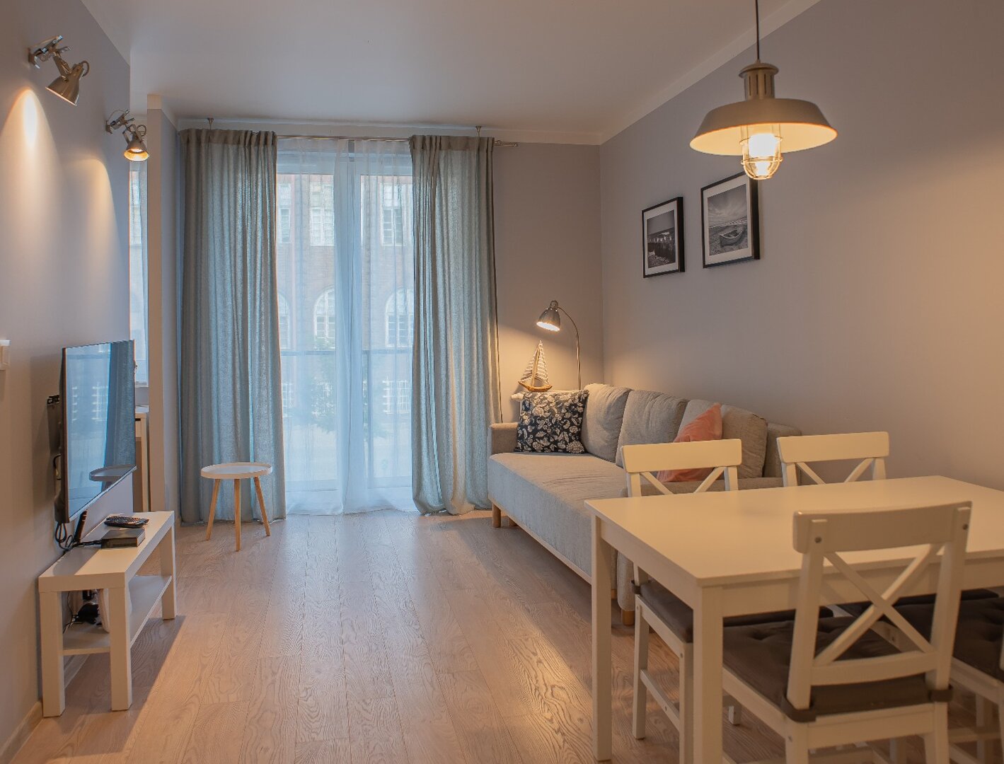 - Apartament typu studio 32 metry kwadratowe położony na 1 piętrze w nowoczesnej kamienicy. Mieszkanie doskonałe dla dwóch osób ceniących komfort i wygodę, możliwość zakwaterowania czterech osób. Mieszkanie całkowicie wyposażone. Otwarta przestrzeń z aneksem kuchennym, pełna zabudowa z AGD: lodówka, płyta indukcyjna, piekarnik. czajnik elektryczny. W części sypialnianej podwójne łóżko, sofa rozkładana, stolik, telewizor, balkon, bezpłatne WiFi. Prywatna łazienka z prysznicem, pralką