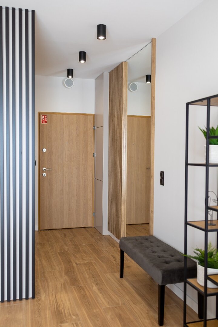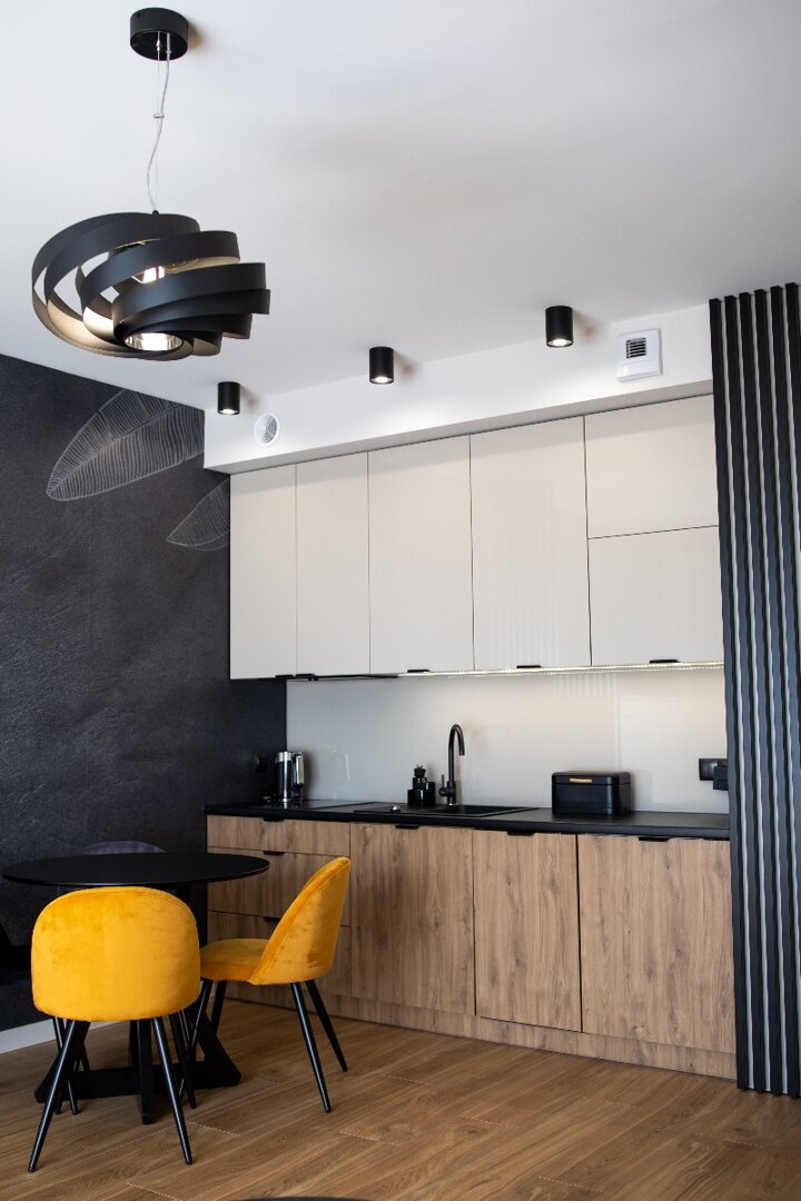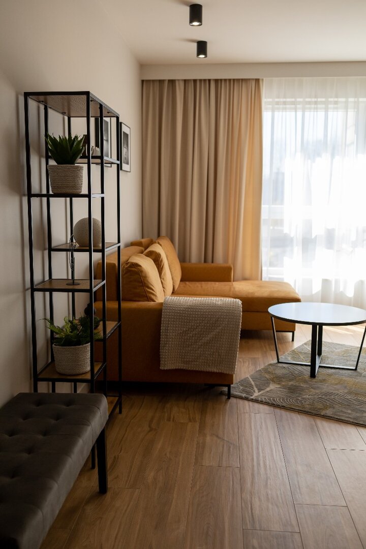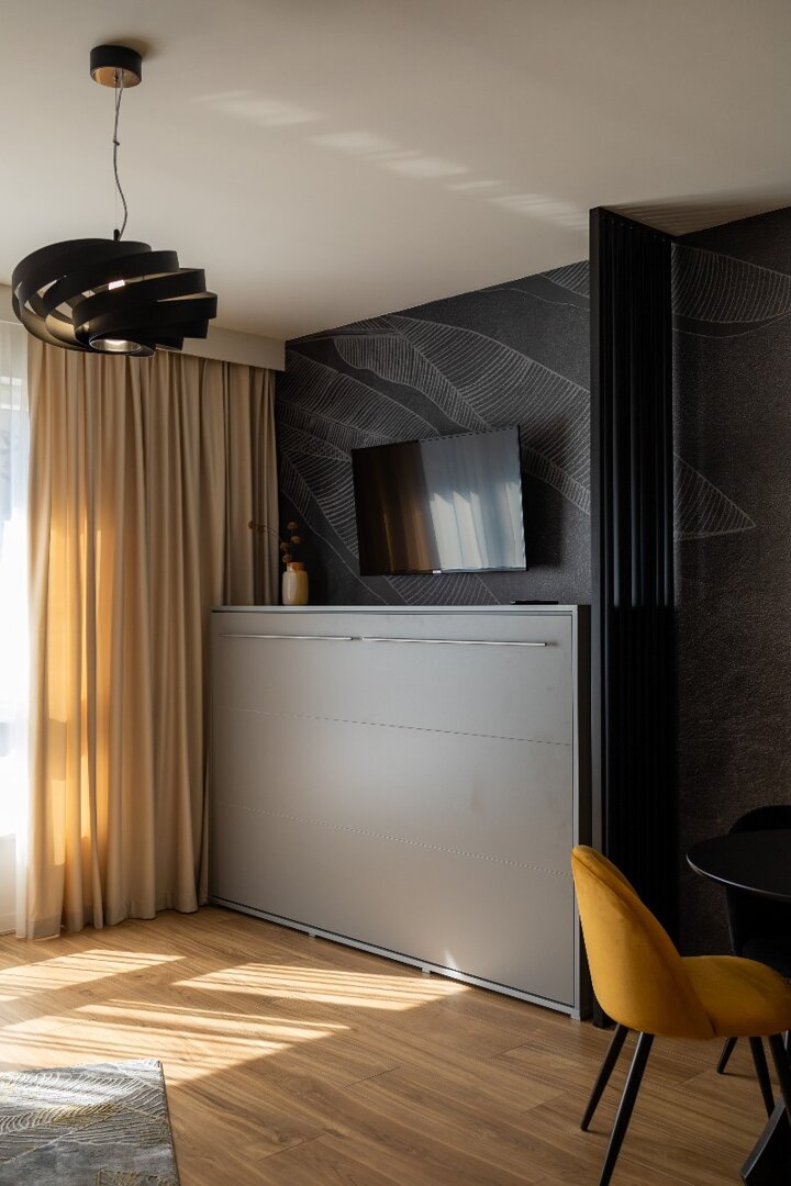 Apartament typu studio 31 metrów kwadratowych położony na 3 piętrze w nowoczesnej kamienicy. Mieszkanie doskonałe dla dwóch osób ceniących komfort i wygodę, możliwość zakwaterowania nawet 4 osób. Mieszkanie całkowicie wyposażone. Otwarta przestrzeń z aneksem kuchennym, pełna zabudowa z AGD: lodówka, płyta indukcyjna, zmywarka, czajnik elektryczny. W mieszkaniu znajduje się rozkładana sofa z możliwością spania oraz drugie łóżko dla 2 osób (półkotapczan), a także stolik, telewizor, bezpłatne WiFi. Prywatna łazienka z pralką oraz z prysznicem.