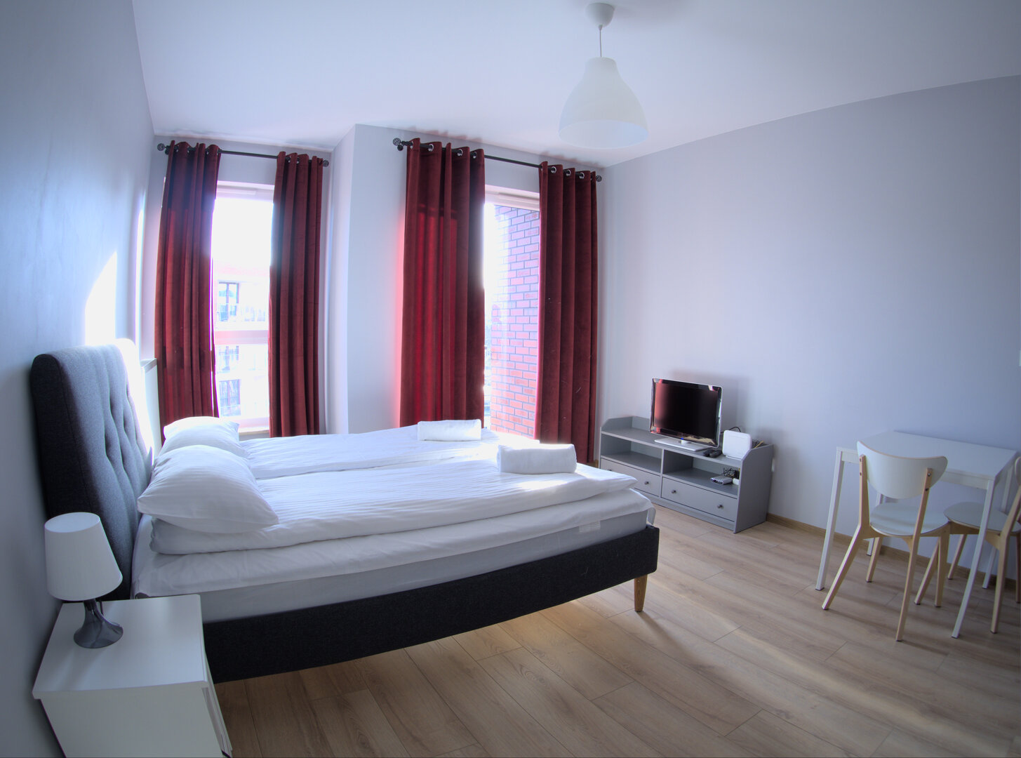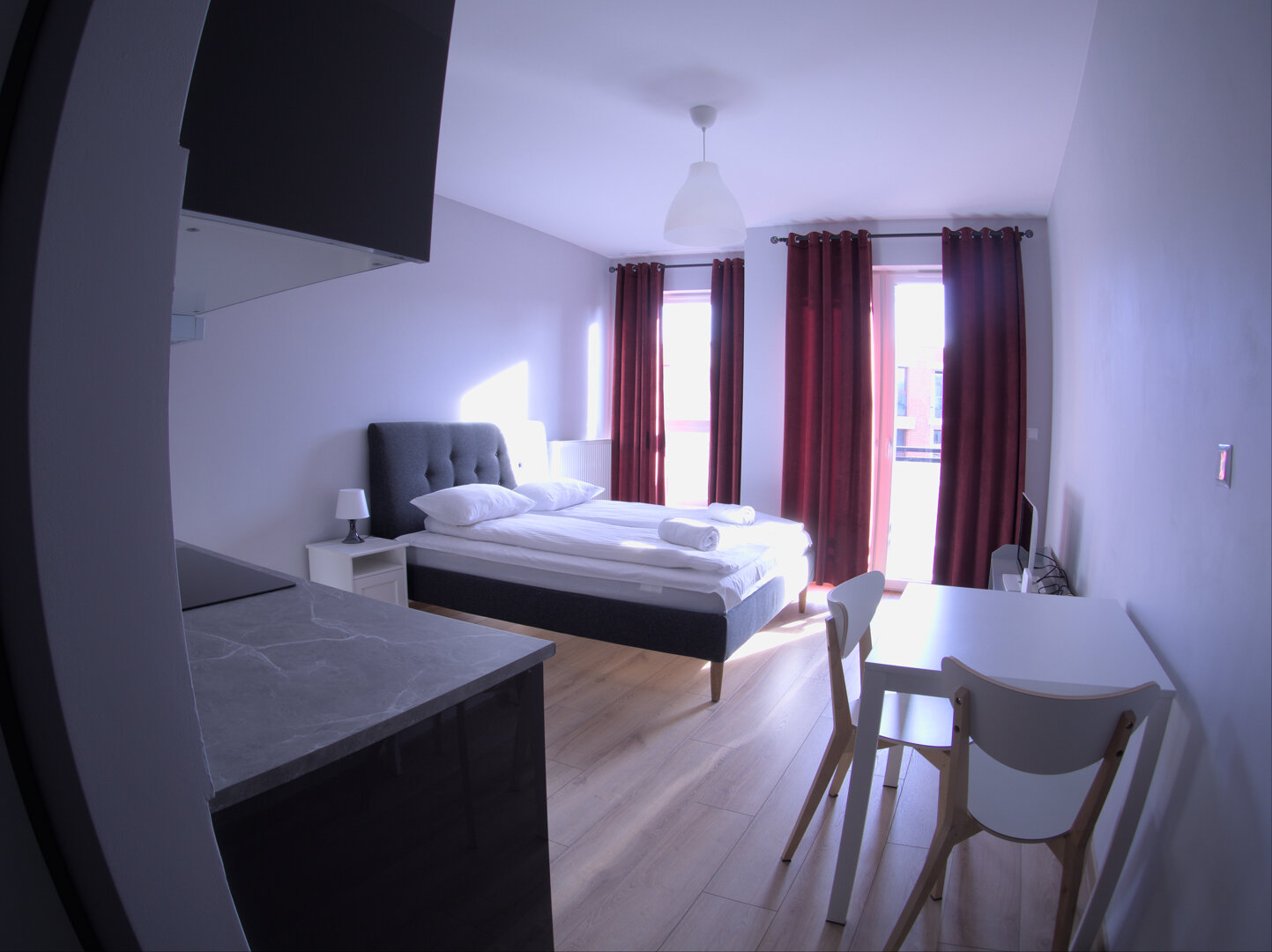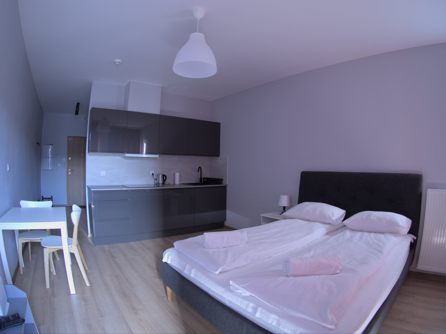 Apartament typu studio 29 metrów kwadratowych położony na 4 piętrze w nowoczesnej kamienicy. Idealny dla dwóch osób. Mieszkanie całkowicie wyposażone w wysokim standardzie. Otwarta przestrzeń z aneksem kuchennym, pełna zabudowa z AGD: lodówka, płyta indukcyjna, czajnik elektryczny. W salonie podwójne łóżko, stolik, telewizor, balkon, bezpłatne WiFi. Prywatna łazienka z prysznicem, pralką.