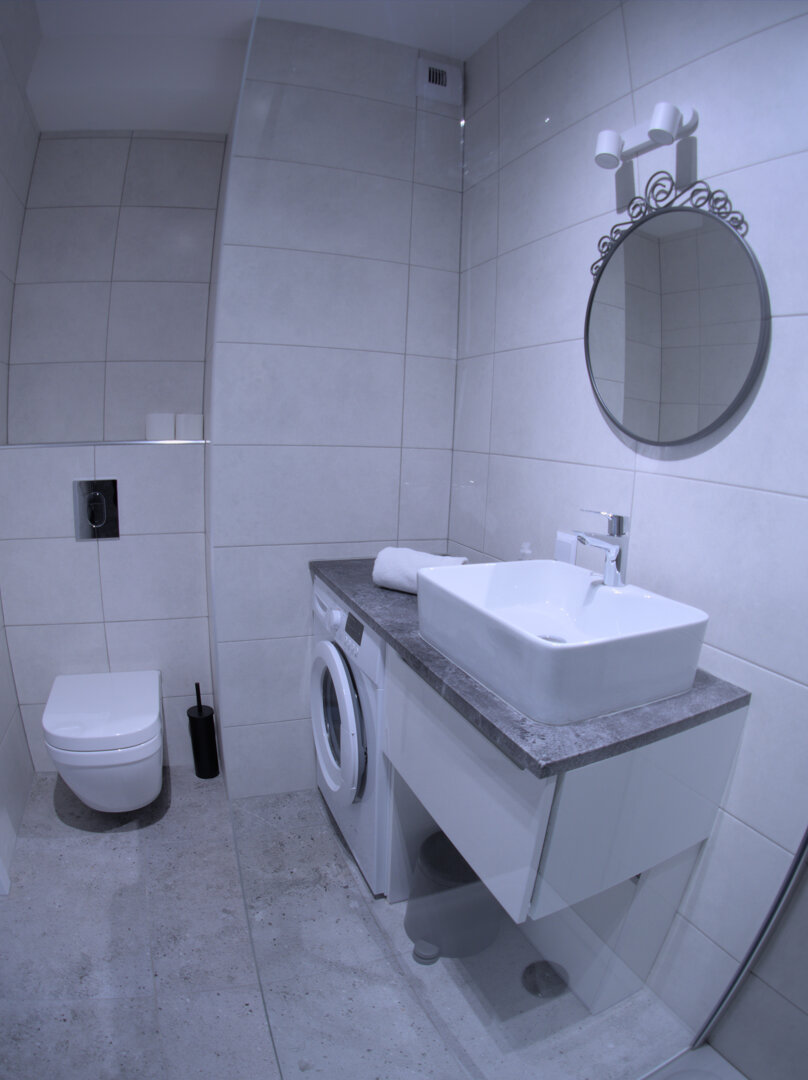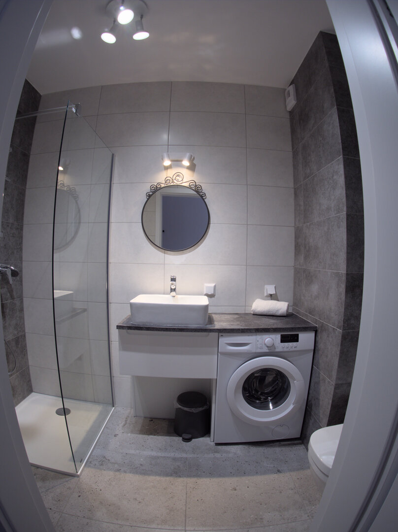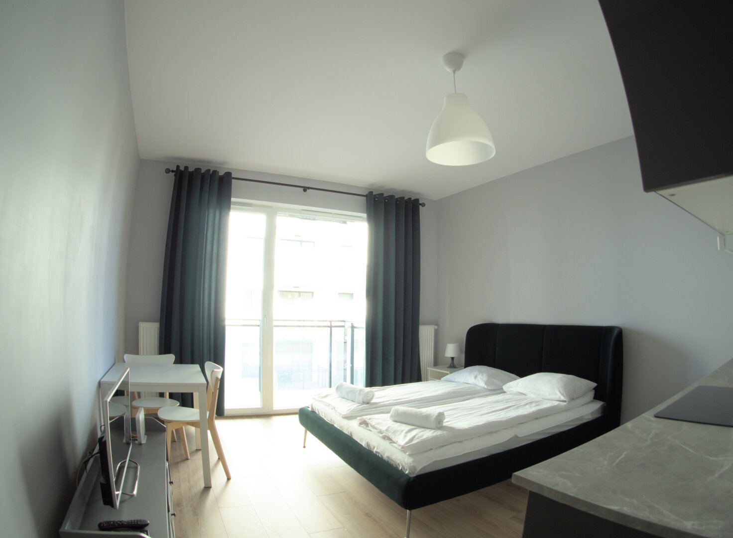Apartament typu studio 29 metrów kwadratowych położony na 4 piętrze w nowoczesnej kamienicy. Idealny dla dwóch osób. Mieszkanie całkowicie wyposażone w wysokim standardzie. Otwarta przestrzeń z aneksem kuchennym, pełna zabudowa z AGD: lodówka, płyta indukcyjna, czajnik elektryczny. W salonie podwójne łóżko, stolik, telewizor, balkon, bezpłatne WiFi. Prywatna łazienka z prysznicem, pralką.